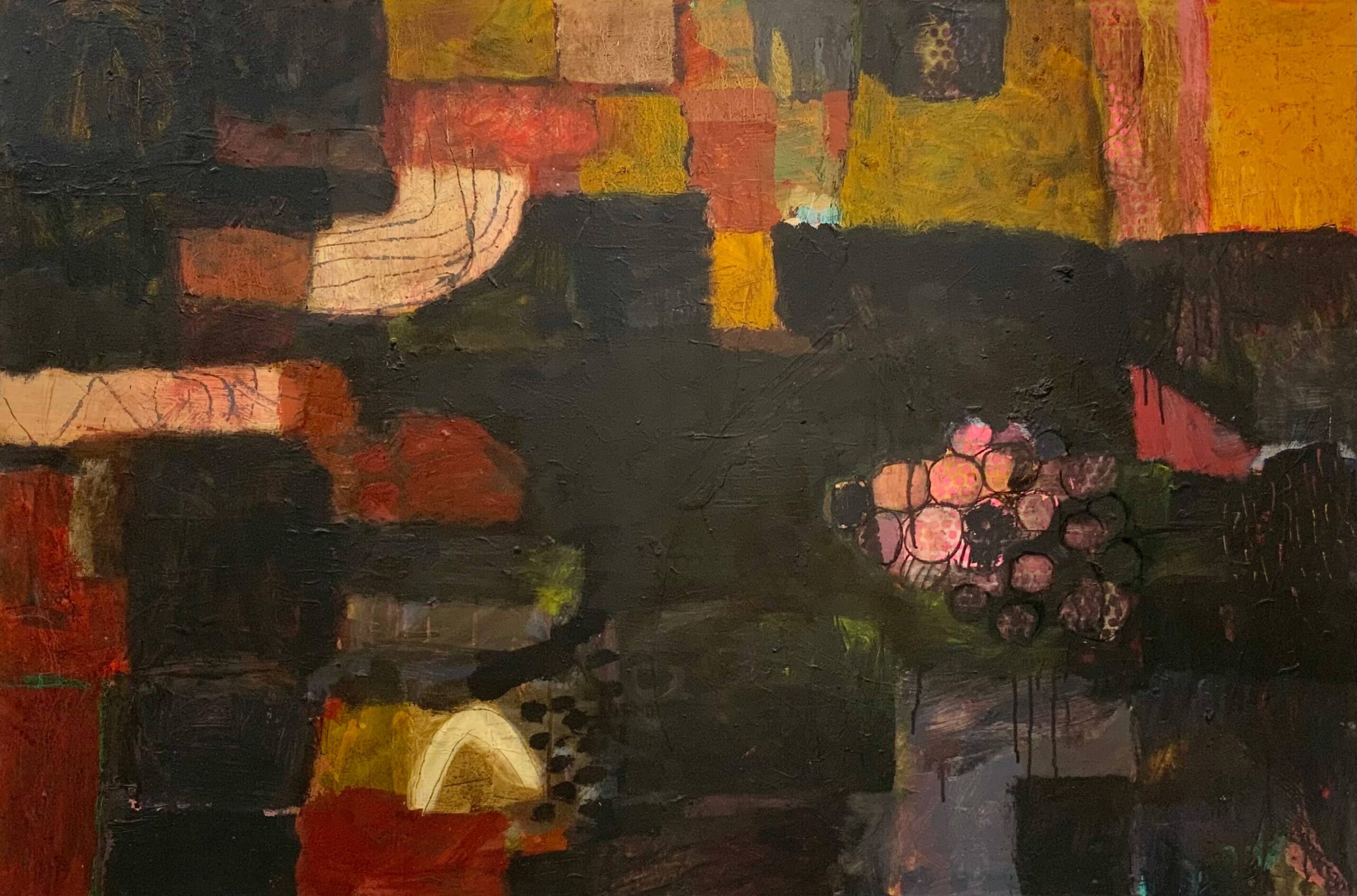 While Geoff’s signature grids still anchor many of these works, there is a newfound looseness—a deliberate messiness—that reflects his recent journey. The exhibition's title, "Feeling the Pinch," speaks to the pressures of creation, the weight of time, and the existential challenges that accompany a serious health diagnosis. Through his art, Geoff processes these challenges, balancing darkness with bursts of optimism and light.